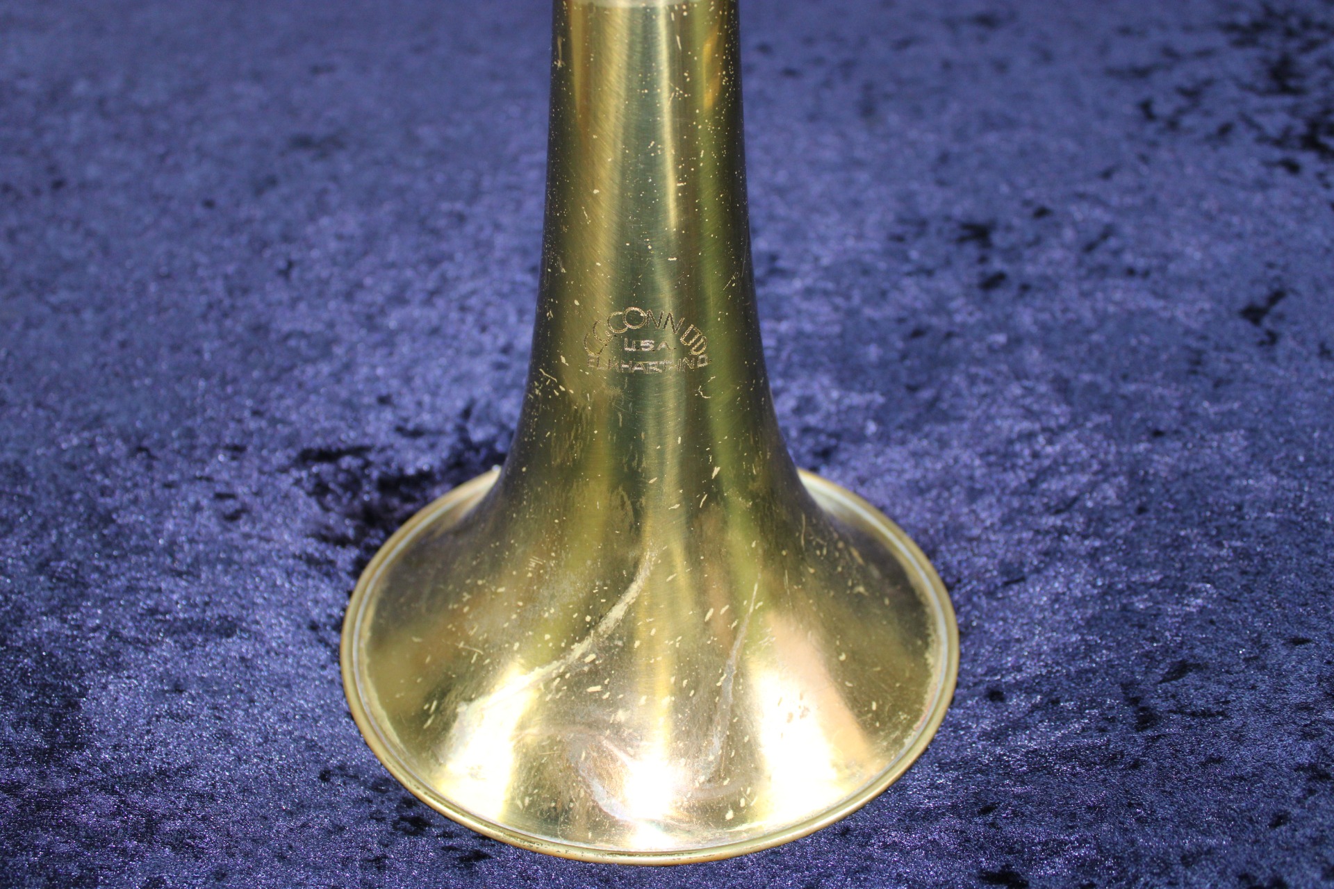These two [30H and 32H] new models were built especially for the theatre, dance, and other large organizations, where great power and volume are paramount. Designed by and named for "Jake" Burkle, dean of Conn experimental engineers, and considered by him to be two of the best he has ever built. Incorporate tapered bore throughout bell, tuning slide, bell taper, slides and hand slide bow. This design, together with new construction bell, produces great flexibility, plenty of bright tone of robust quality, just the right amount of resistance, exceptionally accurate intonation, and amazing ease of response. Every register is of same beautiful quality, the top register being unusually good. Players are surprised at the ease with which high F and the G above bass clef are obtained. Narrowest slides and longest slide bearing on outside slides of any Conn trombone, giving light, fast slide action. Slide lock, bell lock, standard bell 7 and 7½ inches. Bb. Price includes plush-lined case. Selected by such representative stars as Ernie Passoja, high note king, CBS, Chicago, formerly with Horace Heidt; "Mike" Martini, first trombone with Vincent Lopez; Frank Perry with Red Nichols' Orchestra; Harry Kite, first chair with Ace Brigode; Herbert Foll with Stan Myers, Guy Boswell of Cleveland Symphony; Vincent Grande, NBC, N. Y.; and Carroll Martin, great first chair, NBC, Chicago.
