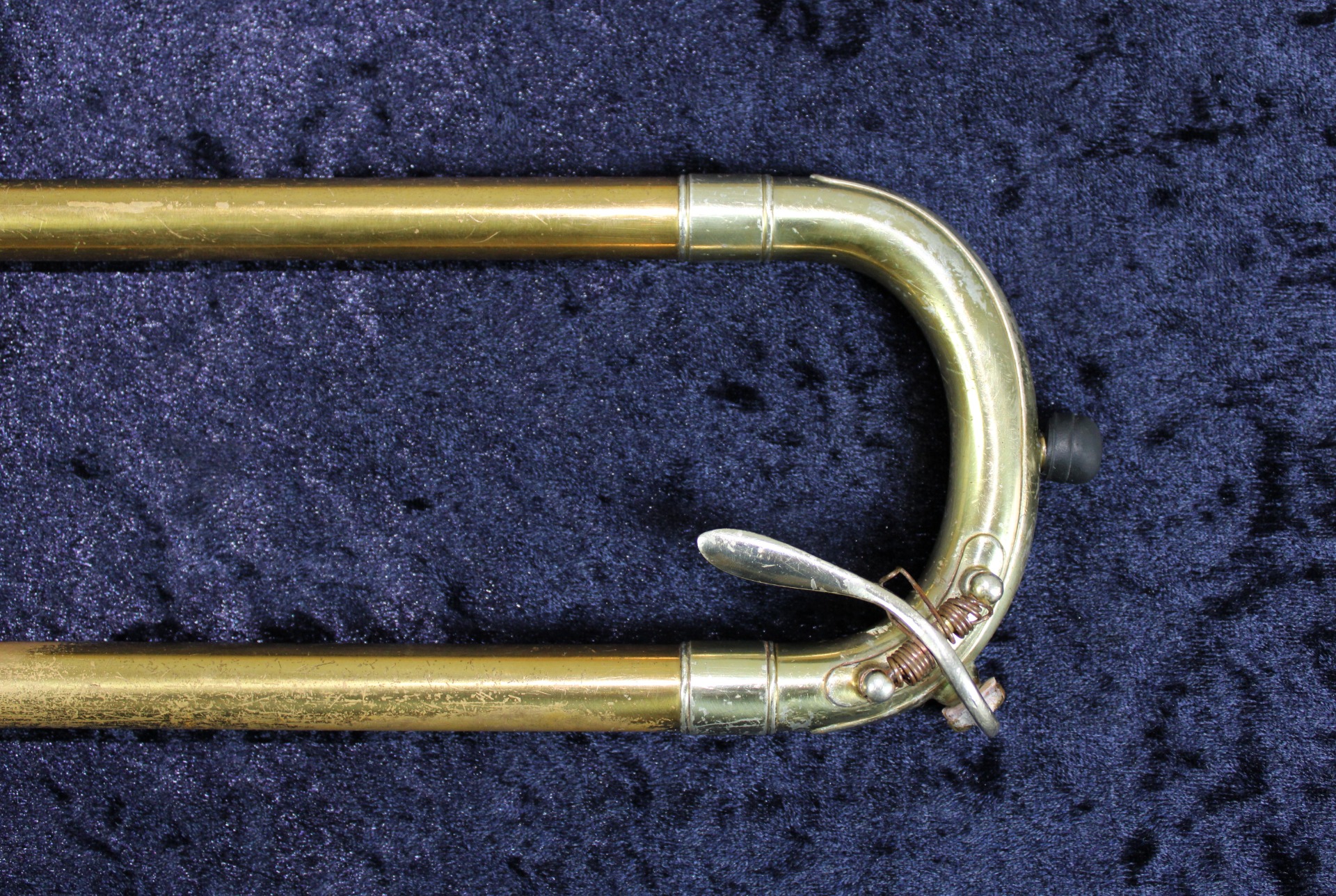 Naast lakschade zijn er ook wat reparaties, kleine deukjes en slijtage zichtbaar; de trombone heeft hierdoor een mooie vintage uitstraling. Instrument is in goede conditie en schuift prima.